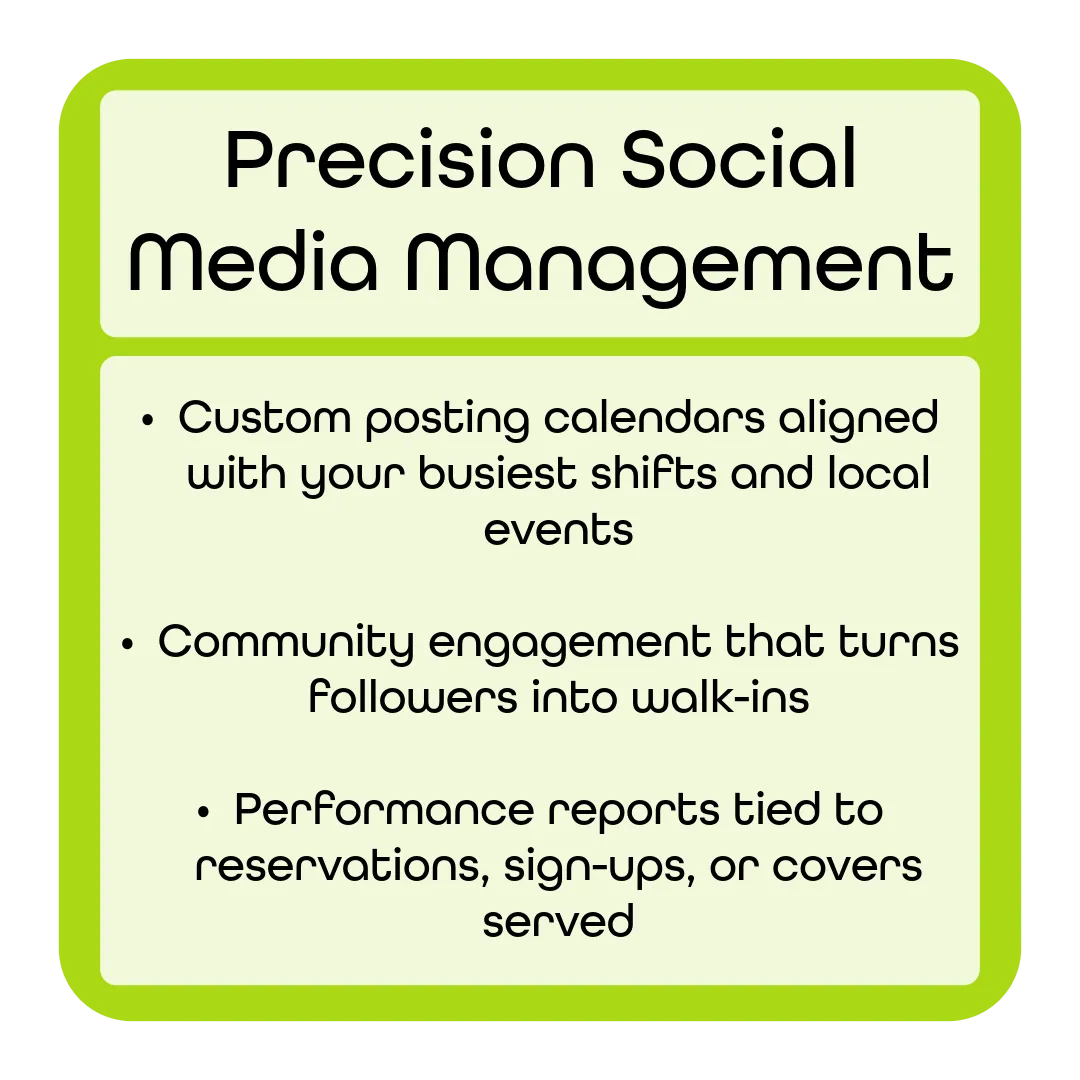 This begins with a complimentary 15-minute virtual audit, where we map your posting habits, review current digital touch points, and pinpoint the exact online levers that move the needle for your operation. Within 72 hours, you receive a proposal and our audit that ties every tactic to measurable outcomes whether that’s 20 more tables on a Friday night, 50 new memberships in 30 days, or a 15% lift in average check size.